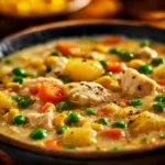 A comforting Chicken Pot Pie Soup that combines savory chicken, vegetables, and creamy sauce, perfect for chilly evenings.