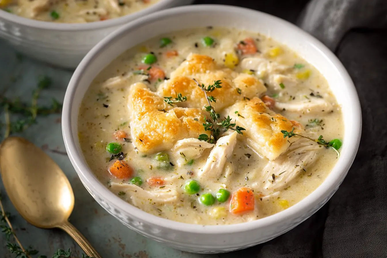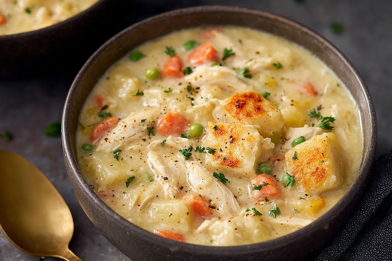 Savor Easy One Pot Chicken Pot Pie Soup a creamy comfort in a bowl Quick prep minimal cleanup make this dish perfect for busy nights Enjoy